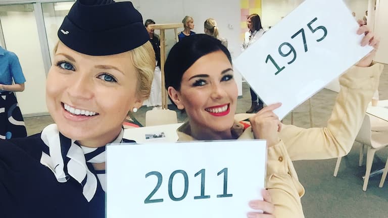 To celebrate the 70th anniversary of Finnair cabin crew uniforms, a fashion show was held at Helsinki Airport in spring 2017. At the event, Mandi represented the 1975’s uniform, while Jenni presented the 2011’s uniform. Mandi remembers the first impression well.